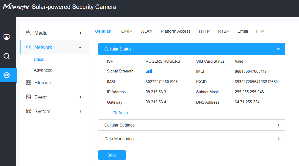 In our first demo, we used a Milesight SP111 4G cellular camera, which includes a SIM card slot and built-in mobile connectivity (it’s also attached to an integrated solar panel and battery packs which have worked impressively, but that’s a topic for another post). After powering the camera and inserting a SIM card from a major mobile carrier, the camera automatically established a connection to the cellular network.